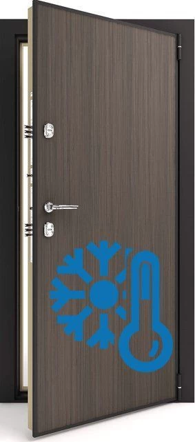 Металлические двери с терморазрывом в Невьянске состоят из двух частей, стянутых болтами, между которыми проложен материал с низкой теплопроводностью. Как правило это тонкое пробковое полотно. Таким образом, во входной двери отсутствует мостик холода, наружная и внутренняя часть двери между собой не соприкасаются, а значит, дверь не промерзает. Наполнение таких дверей тоже может быть многослойным, что создает дополнительную преграду для проникновения в дом холода.