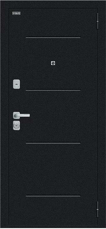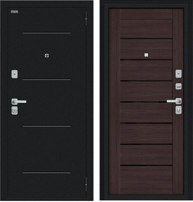 Надежная входная Дверь Браво Техно/BChrome Букле черное/Wenge Melinga премиум класса по цене 35 131 руб. Большая толщина стали защитит от проникновения в ваш дом, квартиру или коттедж. Используется очень качественная фурнитура: замки, цилиндры, ручки, защелки. Покрытие и отделка двери изготовлено под внимательным контролем производителя. Дверь имеет долгий срок службы и гарантию.